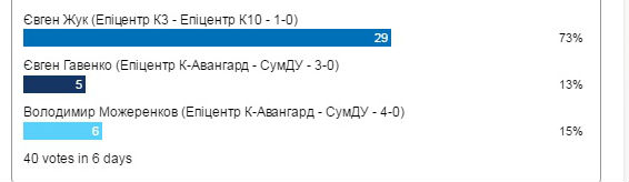 1.Євген Жук («Епіцентр К3») – 29 голосів (73 %);