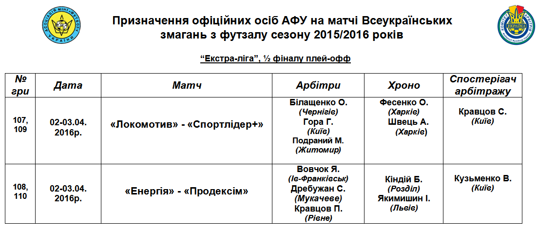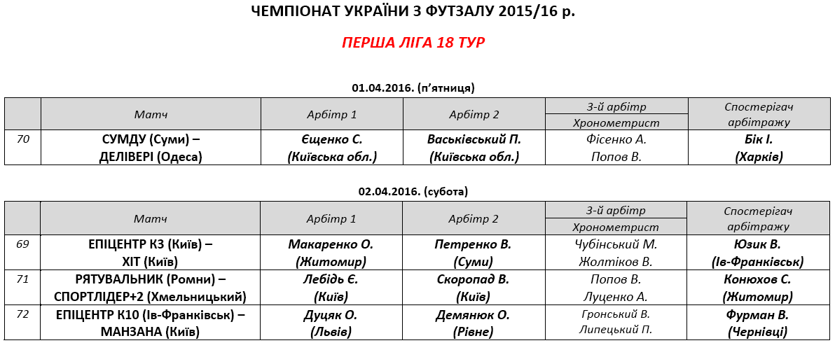 Комітет арбітражу АФУ призначив арбітрів та спостерігачів арбітражу, які будуть працювати на перших півфінальних матчах Екстра-ліги та на іграх 18-го туру Першої ліги: