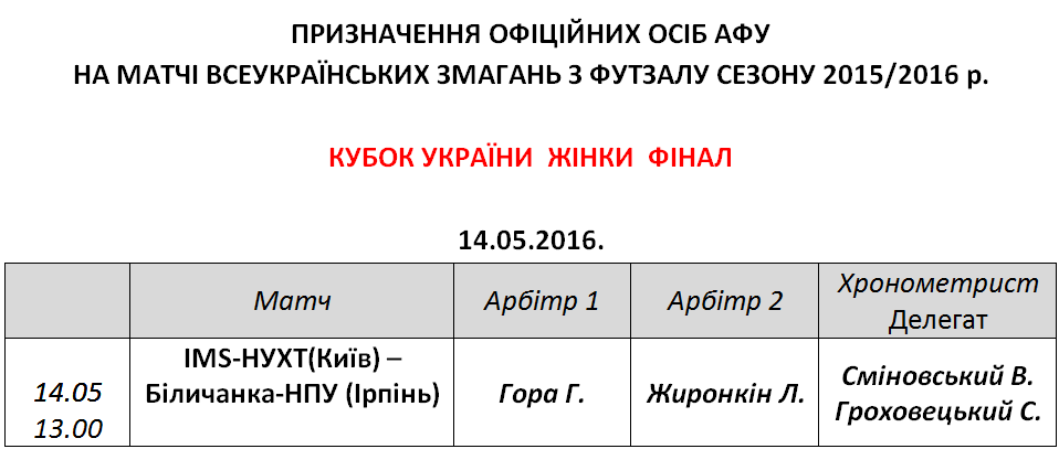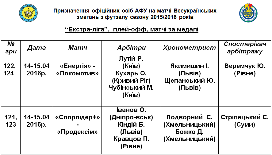 До вашої уваги призначення офіційних осіб на медальні матчі Екстра-ліги, які відбудуться 14 та 15 травня у Львові та Хмельницькому. А також на Фінал Кубка України серед жіночих команд, що відбудеться 14 травня у Києві: