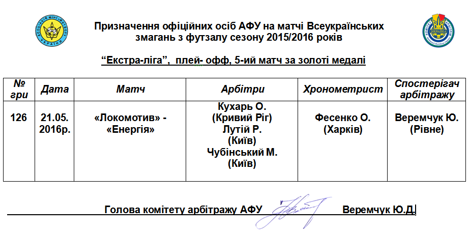 Комітет арбітражу АФУ призначив арбітрів, які будуть працювати на 5-ому, вирішальному матчі золотої серії плей-офф Екстра-ліги "Локомотив" - "Енергія" у Харкові - це Олександр Кухарь з Кривого Рога, а також кияни Руслан Лутій та Максим Чубінський. Хронометрист - харків'янин Олексій Фесенко, спостерігач арбітражу - Юрій Веремчук з міста Рівне.