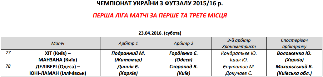 Комітет арбітражу АФУ призначив арбітрів та спостерігачів арбітражу, які будуть працювати на матчах-відповідях 1/2-ої фіналу Екстра-ліги, золотому фіналі Першой ліги та матчі за бронзу Першої ліги:
